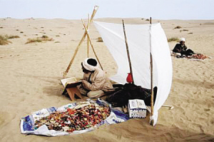 2004年6月,和田市和田縣庫克馬日暮麻扎,民間藝人在表演說唱