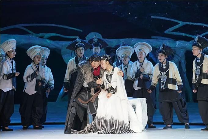 伴隨著委婉動(dòng)聽的歌聲,一部充滿民族韻味的浪漫主義抒情歌劇《小河淌水》就此拉開了帷幕——在茶馬古道上,趕馬哥烏里與月亮坡姑娘依湄相遇相識(shí),兩人用生命譜寫了一曲愛(ài)的贊歌。
