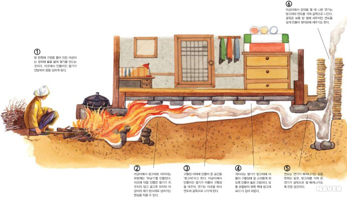在傳統(tǒng)的朝鮮族民宅中,炕和鍋臺(tái)是平齊的,需要燒火做飯時(shí),主婦會(huì)打開(kāi)架在柜臺(tái)一側(cè)的移動(dòng)木板,下到地面水平線以下的“灶坑”點(diǎn)火做飯。傳統(tǒng)的炕采用長(zhǎng)筒式結(jié)構(gòu),煙火由一洞內(nèi)循環(huán)排出,使每洞都有煙火串入,炕即溫?zé)帷3r族的火坑高度為30-40厘米,但炕洞向下挖入,炕面抹白灰,表面糊油紙或鋪草簾子,炕面平整。隨著物質(zhì)條件的改善,炕面改鋪纖維板或者地板膠,既美觀又耐用。