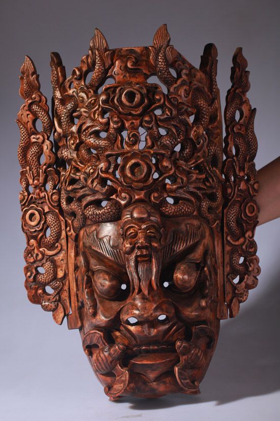 描述:程咬金,字義貞,原名咬金,后更名知節(jié)。驍勇善戰(zhàn),歷史上是唐朝開國名將,以“三板斧”的形象在民間廣為流傳。在地戲唱本《薛仁貴征東》和《薛丁山征西》中,均有程咬金的出場。根據(jù)《隋唐演義》的內(nèi)容,程咬金雖然頭腦簡單,卻是個有福之人,被認(rèn)為是福將,所以在地戲面具的刻畫上,在嘴角兩側(cè)雕刻上一堆蝙蝠,以取“?!钡闹C音。又因為程咬金在唐代算是長壽之人,故爾額頭上刻一壽星,帶給人福壽雙全的吉祥含義。