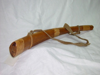 鄂溫克族牛角形帶箍木質(zhì)鹿哨,長(zhǎng)71厘米,紅松木質(zhì)地,1946年制作,鄂溫克族傳統(tǒng)擬聲狩獵工具,也作為樂器。征集于內(nèi)蒙古自治區(qū)喀爾古納左旗,藏于民族文化宮博物館。鹿哨是中國(guó)北方及東北亞狩獵經(jīng)濟(jì)文化類型的重要實(shí)物遺存,有鮮明民族與地域特色。