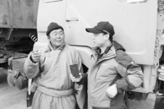 2017年,王玉龍(右)在內(nèi)蒙古二連浩特采訪蒙古國(guó)卡車司機(jī)。 受訪者供圖
