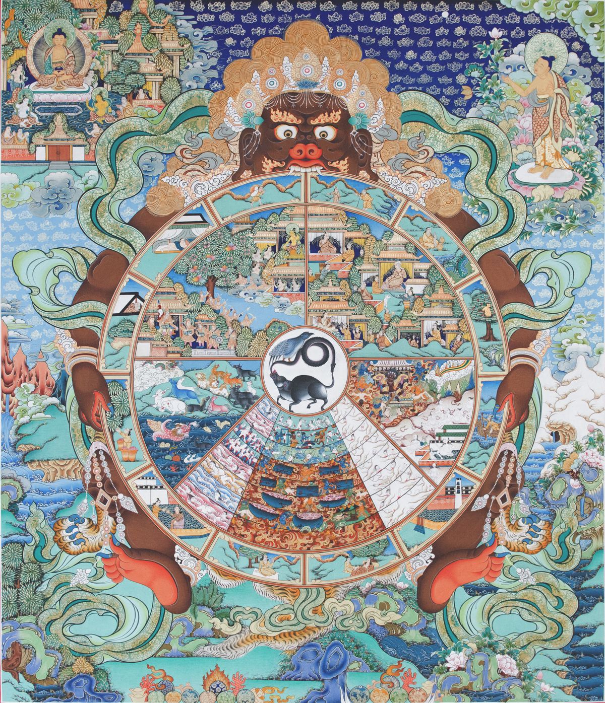 一切有情,皆以諸欲因緣,自作自受,如車輪回轉(zhuǎn)不已,生死于六條道趣,接受制裁。所謂六道,即:人、天(化生)、阿修羅(魔)、地獄、餓鬼、畜生(三惡道)。然在六道中,卻以人道為中心,因人心的善惡觀念而隨心所欲的去追求,造成報果。如人在日常中的語言、動作、思想,守法實踐持三戒(五戒:不殺生、偷盜、邪淫、妄言、飲酒)以上者,可得六根整然的人身,五戒圓備者,即生大富大貴之家,長壽而揚名于世。修持五戒,加行十善(身:不殺生、偷盜、邪淫??冢翰粣嚎?、妄言、綺語、兩舌。意:不貪、瞋、癡。),即生天界,天分為欲界天、色界天、無色界天。上述五戒加十善,乃生欲界天,再加修正觀坐禪,證初禪至四禪,即生色界天。趨入四空定,即生無色界。但雖至非想非非想天,還是降伏業(yè)惑而已,無法脫離生死輪回,故古人說:三界無安,猶如火宅。如果人于日常生活中,雖有十善心布施,但帶有名利好勝,即生阿修羅界(須彌山腰),阿修羅是具天福而缺天德,因地污曲所致。如果人于日常中,失去道德戒行,生起慳貪心,即墮餓鬼道界,生起瞋癡心,即墮畜生界,犯五逆十惡者,即墮地獄界。以上釋義引自《君友會、六道輪回卷》綜上:六道輪回的善惡報趣,盡在人心的一念,能趨于善,即上升天界,起一念惡,即墮惡道,因果昭彰。