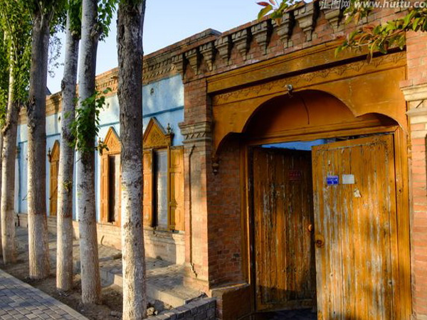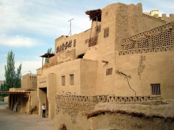 維吾爾族的居室一般是土木結(jié)構(gòu)平房,其建筑方式是以粗木或沙石作基,土塊砌墻,或笆子墻,房頂架梁檁、椽后鋪葦席加土抹泥。房屋平頂,開(kāi)天窗采光,四壁不開(kāi)窗只留門(mén),房門(mén)忌朝西?,F(xiàn)在,建筑式樣發(fā)生變化,多留壁窗,建材也多由土木結(jié)構(gòu),向磚、混凝土結(jié)構(gòu)發(fā)展。室內(nèi)布置過(guò)去較為簡(jiǎn)單,一般多砌土炕,炕一側(cè)隔矮墻砌鍋臺(tái),墻上留有壁翕,放置物品,喜掛壁毯。冬季多燒爐子、火墻取暖。院內(nèi)多植有葡萄和果樹(shù)花卉。房門(mén)口兩側(cè)砌土臺(tái),上鋪氈毯,用以夏天乘涼、睡覺(jué)。