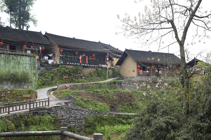 梨子寨共有28戶人家,當(dāng)年全寨烏黑破落的房屋如今全部修繕一新,并保持了苗族民居青瓦、木板、竹籬、黃泥墻的特色,寨子里的泥土路也鋪上了青石板,屋頂、院壩、石階、游道及田頭落滿了白色梨花花瓣。穿青衣包頭帕的苗族女子在田間鋤地、拔草,青山環(huán)抱的梨子寨無比清幽。