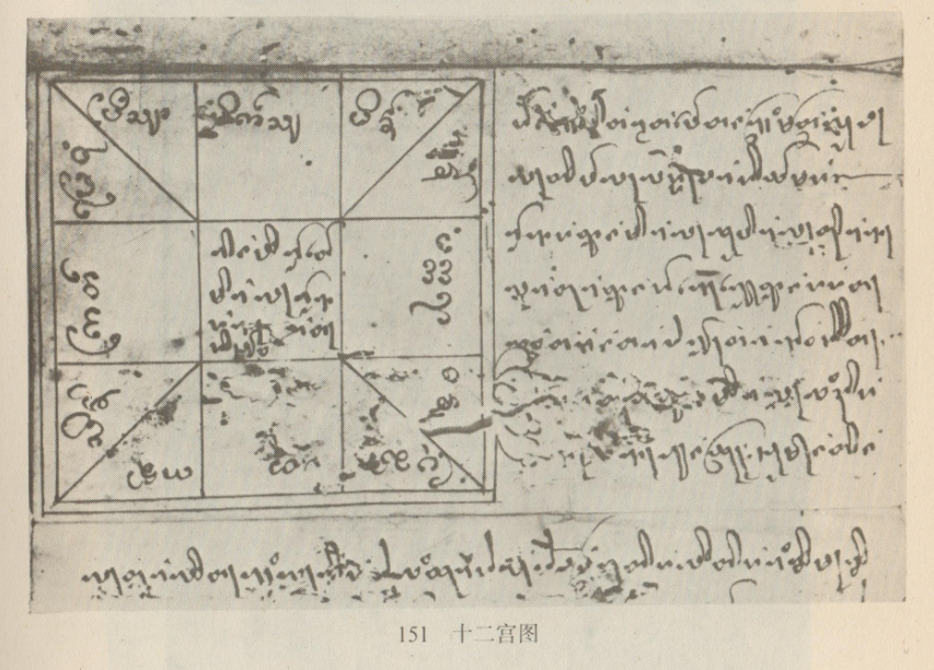 傣哪文天文著作中保存的傣繃文黃道十二宮圖。圖分13格,周圍12格寫傣繃文十二宮名,以上中格為起點(diǎn),往左其順序?yàn)榘籽驅(qū)m、金牛宮、雙子宮、巨蟹宮、獅子宮、室女宮、天秤宮、天蝎宮,人馬宮、摩羯宮,至雙魚宮與白羊?qū)m銜接。中格及圖外說明皆傣哪文。為罕見的兩種傣文合壁的天文學(xué)資料。原件存民族文化宮。