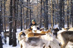 人類(lèi)馴養(yǎng)馴鹿的歷史有1000多年。這是一種異常勇敢的生靈,生活在北極圈附近,分布在歐亞和北美大陸及一些大型島嶼。在極度惡劣的自然條件下,馴鹿為了繁育后代,每年都要冒著生命危險(xiǎn)長(zhǎng)途跋涉數(shù)百里,其堅(jiān)韌不拔的意志力和不屈不撓的品格正是北極冰原精神的象征。在中國(guó),馴鹿棲息在大興安嶺北段的寒溫帶針葉林中,處于半野生狀態(tài),這里有激流河、阿穆?tīng)柡?、阿巴河、呼瑪河,有阿龍山、奧克里堆山等。食物主要是苔蘚,也吃石蕊、蘑菇及大木植物的嫩枝葉。鄂溫克族的祖先把鹿視為圣潔,賦予其許多美麗的神話和傳說(shuō)。是啊,只要有了馴鹿,鄂溫克人便是幸福的。據(jù)考證, 我國(guó)的馴鹿與貝加爾湖東北部尼布楚河上游溫多苔原高地的馴鹿有淵源關(guān)系??梢哉f(shuō),鄂溫克人的馴鹿、狩獵、樺皮文化、薩滿教把北極文化延伸到了興安嶺。