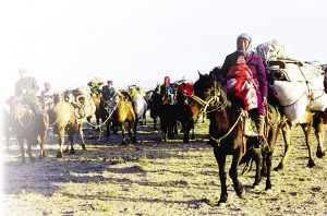 那是一支浩浩蕩蕩的隊伍,每戶人家的家就在那三四頭駱駝的背上,駱駝的先后排列也是有講究的