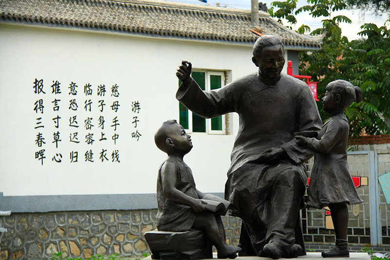 村子的胡同干凈整潔,精心設(shè)計的院墻上分別繪制著中國古代《二十四孝圖》浮雕、新編《二十四孝圖》彩繪圖、國學名言名句磚雕以及各種助人為樂兒童圖畫。