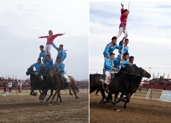 蒙古族的馬術表演非常精彩,有很多項目。“跨越障礙”是在運動場跑道上每隔幾十米設置一個高1米的跨欄。跑道終端立著一個直徑約2米的火圈,矯健的坐騎從起跑線踏蹄起跑,越過跨欄,鉆過火圈直達終點。“乘馬斬劈”是在200-250米的距離之間樹起十幾個目標。騎手們手持馬刀,疾馳如飛,經(jīng)過一個個目標時舉刀劈砍,刀起標落?!榜R上技巧”是由運動員們在飛馳的馬背上做出各種造型動作。運動員一般八九歲就要在馬術隊接受嚴格的訓練。技巧表演可分單項和多項,其中又包括單人單馬、單人雙馬、雙人雙馬和多人多馬。一匹飛奔的馬經(jīng)過騎手身邊,騎手可以突然抓住馬鬃翻身上馬,又會突然下馬腳尖點地再躍上馬背。其他技巧還有在馬背上“空翻倒立”“側方隱蔽”“樓里藏身”以及驚險的“馬上疊羅漢”等表演【如圖,劉軍攝影,編者修剪合成兩圖】。