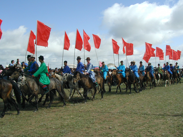 蒙古民族幾乎人人都天生酷愛馬,也很會訓練馬,若在過去,作為馬背民族更是離不開馬。好馬、好騎手一直享有極高的榮譽。因此,賽馬當然成為牧民最喜愛的運動。蒙古族賽馬一般分賽走馬和賽奔馬兩種。賽走馬是指讓鞍具齊全并釘有合適馬掌的馬跑對側步(即前后蹄一順交錯前進),比馬的速度、耐力、穩(wěn)健和美觀。有豐富經(jīng)驗者才能騎出走馬來,所以,參賽的馬多用5歲以上的成年馬,騎手也以成年人為主。比賽時,要求騎手有高超的騎術,能夠駕馭好馬,使其既走得快、穩(wěn)、美,又不能跑起來。還要求馬抬步越高越好,這樣顯得很有“風度”,這不僅取決于馬掌的重量,還要看馬的素質。一匹好的走馬,即便在牧區(qū)也價格非常昂貴。賽奔馬是比馬的速度和耐力,以先到達終點者為勝。奔馬的步伐與走馬不同,是四蹄分前后成雙交錯奔跑。參賽的選手多為十二三歲的小男孩,因為他們體輕敏捷。為了減輕馬的負荷和照顧騎手的安全,奔馬都不備鞍具或配備輕巧的鞍具。騎手們只穿華麗的彩衣,頭束紅綠飄帶,顯得英武、神氣。賽程一般長25至35千米。奔馬賽比走馬賽普遍,參賽的人數(shù)也多,少則幾十,多則逾百。比賽開始,選手們迅速躍馬,揚鞭飛奔,觀眾則雀躍歡呼,吶喊助威【圖為馬隊進場儀式,劉軍攝影】。
