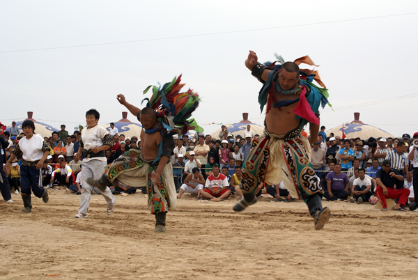 蒙古族摔跤(搏克)既不同于中國式摔跤,也不同于日本的相樸,其規(guī)則、方法、服裝、場地等方面都有自己的特點。比賽規(guī)則和方法是:不分等級(不分年齡、不分體重),沒有人數(shù)限制,只要是2、4、6、8、16、32、64、128等雙數(shù)即可。所有選手由德高望重的裁判負責編排配對或抽簽配對后上場。比賽實行單淘汰制,一跤定勝負,失敗者不許再上場。每輪淘汰半數(shù)。裁判員發(fā)令后,雙方握手致意,然后開始交鋒,一般不限時間,可以采取勾、拉、踢、絆、推、抱、舉等各種方法和技巧,但不能抱腿摔,也不準亂踢,更不能扯褲子,膝蓋以上任何部位著地即為失敗。摔跤手有專用服裝,上身為牛皮或帆布制成的緊身半袖坎肩“昭德格”,下穿肥大的摔跤褲,腳蹬蒙古靴,頸上套五顏六色的布條項圈。比賽場地簡單,只要有一片草坪或松軟空地,觀眾席地圍坐,摔跤手就可以在中間進行比賽。賽前,雙方都有人高唱挑戰(zhàn)歌,以造聲勢。摔跤手入場、退場時都要模仿虎步或鷹步動作,跳躍行進,威武雄壯。冠軍獲重獎,并在民間享有極高聲譽【圖為跳躍入場的摔跤手,劉軍攝影】。