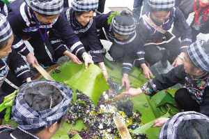 布依同胞正熱情地為各位嘉賓、朋友備送布依“三月三”花米飯