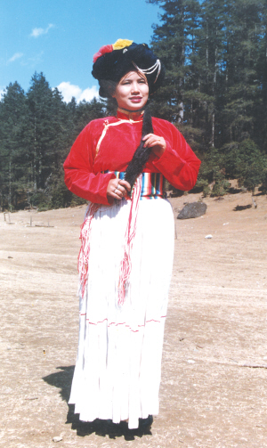 寧蒗地區(qū)的普米婦女多穿束腰、多褶的百褶裙,常用白藍(lán)等色的棉麻布制成,裙長幾乎拖至腳面?;顒訒r(shí),她們將裙子從左面提起,掖在腰間。