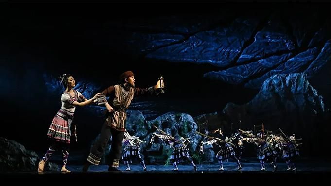 “花腰帶”既是精美的舞蹈道具,又是劇中人物情感的寄托,在整部舞劇中反復出現。特別是在雙人舞中,“花腰帶”將人物間無形的關系幻化成有形的聯(lián)系。劇中的蘆笙舞段,不僅僅是男女之間情愛的表達,更突出表達了“開山人”為了讓窮鄉(xiāng)告別貧苦,為大愛舍小愛、努力奮斗的決心,以及對美好生活的向往。傳統(tǒng)民族舞蹈在這部劇中被賦予了不同的含義。