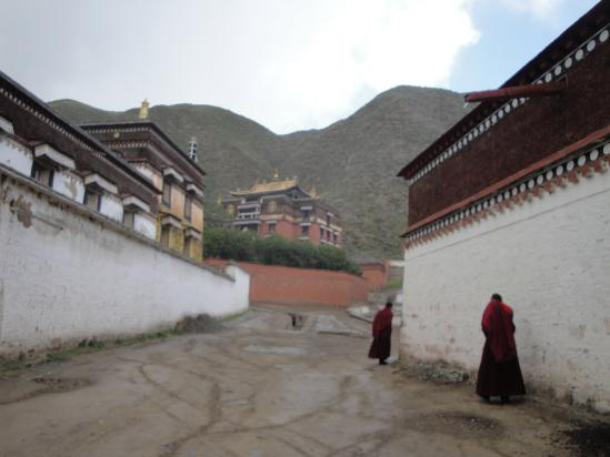 在狹長(zhǎng)的盆地上,各式建筑星羅棋布,金瓦紅墻,雕梁畫(huà)棟,華麗非凡。僅圍墻就長(zhǎng)達(dá)3公里余。五百多間連續(xù)回廊及一千多個(gè)“嘛呢轱轆”,將寺院與外界隔絕。整個(gè)寺院外部墻垣、院地、臺(tái)階均以石砌為主,內(nèi)部戶(hù)限、柵欄、棟梁、門(mén)栓均以木料為主,故有“寺院外不見(jiàn)木,內(nèi)不見(jiàn)石”的說(shuō)法。