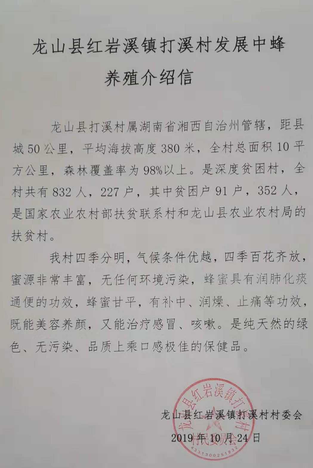 這里四季分明,氣候條件優(yōu)越,四季百花齊放,蜜源非常豐富,無任何環(huán)境污染。據(jù)湖南省湘西州龍山縣紅巖溪打溪村支部書記沈世平介紹:“我們這兒已經(jīng)有很長的養(yǎng)殖蜜蜂的歷史,環(huán)境無污染,田土少,屬于純天然養(yǎng)殖,無農(nóng)藥,利于中蜂的養(yǎng)殖,并且在2019年4月份的時(shí)候,通過農(nóng)業(yè)部及農(nóng)業(yè)科學(xué)院的專家實(shí)地考察,認(rèn)證為最佳養(yǎng)蜂環(huán)境。今年獲得鄉(xiāng)政府幫扶,規(guī)劃從龍山縣中心養(yǎng)殖合作社引進(jìn)50箱進(jìn)行集中養(yǎng)殖,明年開始分設(shè)4點(diǎn),一個(gè)點(diǎn)150箱,擴(kuò)大產(chǎn)量,并向全縣推廣。”