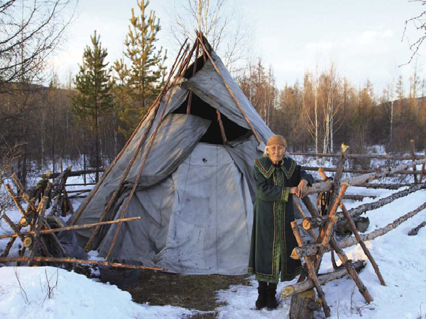 撮羅子的選址,是在地勢(shì)較高、陽光能照射到而且水和柴草就近可取的平坦之處。其蓋造方法,是用三五根約碗口粗細(xì)上有枝杈的木桿,相互交合搭成上聚下開的骨架,然后再用30根左右木桿搭在骨架之間捆綁固定,在南面(或東面)留出門,即基本成型。木桿搭起的只是“屋架”,外面還要覆蓋才能遮風(fēng)擋雨。按照季節(jié)的不同,分別用樺樹皮、草簾子和犴、狍等獸皮,做成自上而下一層壓一層的圍子,綁在木桿上,門簾則夏用草或樹條編,冬用狍皮做成。