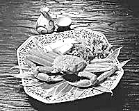 撒嘎當(dāng),即螃蟹剁生。以新鮮螃蟹為主要原料,配以糊辣椒粉、姜末、蒜泥、芫荽、南瓜籽、炒米面等佐料調(diào)制。加工時,將螃蟹敲死放在火塘中翻燒至熟,去掉硬殼后剁細成泥狀,加適量食鹽、糊辣椒末、蒜泥、熟南瓜子面、炒米面調(diào)拌均勻即成。這道菜味香、辣、鮮,用糯米飯蘸吃,或用蘿卜、白菜、水薄荷、野芹菜等蘸吃均可。