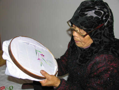 刺繡花草圖案和幾何圖形,是回族婦女刺繡的絕技。如枕頭、坎肩、掛圖、圍裙等處繡的花卉,形象非常逼真。有些刺繡作品,很注意變化裝飾,給人以整體美。她們往往擷取大自然中各種不同的植物葉,構成自己想象中的花草樹木,技與葉、花與蔓和諧地統(tǒng)一?;刈鍕D女刺繡技藝,既富有生活特色,又充滿美好愿景。