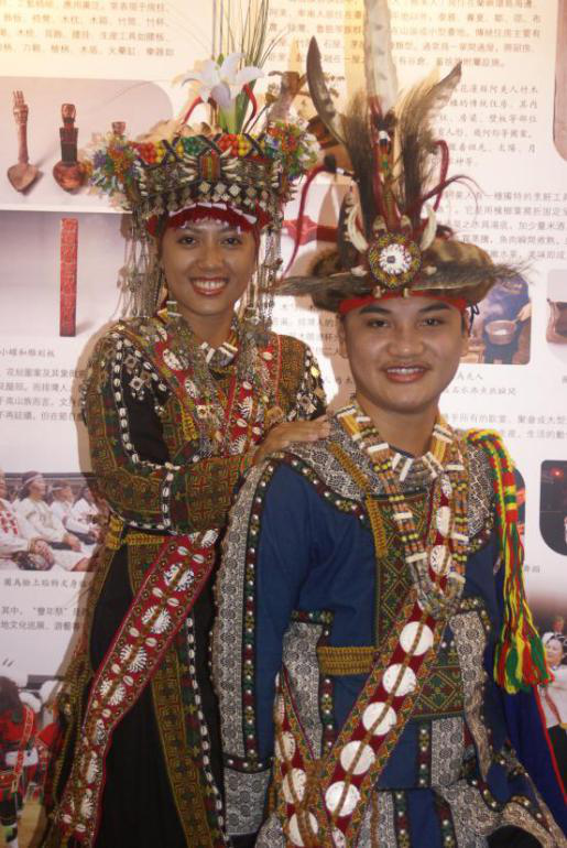 高山族過去以裸身為美,裸形赤足,僅以獸皮、樹皮及植物纖維制作的幅布蔽體,有鑿齒、穿耳的習俗。接觸漢文化后,逐步形成了男著長衫、女著裙裝的習慣,衣服除了獸皮和樹皮外,還喜好用自織麻布,飾以彩色紋樣。