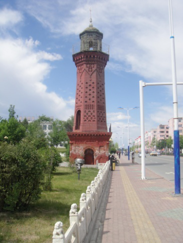 雙塔,距紅樓不遠(yuǎn),是于19世紀(jì)末和20世紀(jì)初兩名烏孜別克族商人捐建的“宣禮塔”。雙塔呈鐵紅色,造型峻拔,塔身上的磚雕,菱形、圓形、六角星圖案美感別具風(fēng)味,圓形琉璃的塔頂,亮如翡翠,通過(guò)塔座上的小木門可登上塔頂。這座雙塔體現(xiàn)了典型的俄羅斯建筑風(fēng)格。