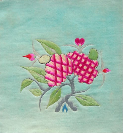 1.平針繡,又稱“直針”,是滿族枕頂刺繡最基本的針法之一,它能準(zhǔn)確地表達(dá)植物花卉、動物禽獸、人物、器物等。在所有針法中,平針是分布最廣、使用范圍最大的針法。它的運針方式是起針、落針都在圖案的輪廓邊緣,針腳排列均勻,線跡平行,不重疊交錯,紋樣之間的線條靠空出地面來表現(xiàn)。