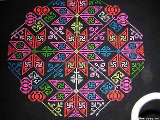 刺繡針法主要有鎖繡、平針繡、參針繡、壓針繡和眉毛花、納紗繡、補花繡、十字繡、編針繡、牽花繡、緝針繡、云子花等。鎖繡針法采用繡線環(huán)圈鎖套而成,即線線成環(huán)、針針套扣,落針在起針旁,最后繡成的紋路效果如鎖鏈結(jié)構(gòu),因而得名鎖繡。羌族鎖繡發(fā)展成為各式針法,并成為羌族刺繡的重要針法。鎖繡主要運用于圍腰上的裝飾紋樣,平針繡又稱“齊針繡”,是繼鎖繡之后另一種古老而傳統(tǒng)的針法。平針繡的繡線排列整齊均勻,不露地、不重疊,以繡跡的絲理顯現(xiàn)紋飾的質(zhì)感,繡紋具有閃光緞面的效果,多用于小塊面的刺繡。參針繡又稱“套針繡”,是在平繡的基礎(chǔ)上增加深淺變化,以表現(xiàn)花、葉等紋樣的明暗,使大面積的紋樣層次豐富而有立體感。在平繡和參針繡的基礎(chǔ)上,羌族婦女創(chuàng)造了壓針繡的針法,她們又稱之為“撇花”。在繡一針長線后,又用一針短線壓在原長線上,并確保每繡一針長線后均在同一位置壓上短線,如編籬笆一般,紋樣邊緣整齊,紋樣內(nèi)的繡線交錯有致,產(chǎn)生富有變化的視覺效果。穿花繡、九針繡,多用于頭帕以及飄帶上。納紗繡的針法是在素色面料上按經(jīng)緯紗線交織的孔進(jìn)行刺繡,并沿著一個方向施針,如垂直的經(jīng)線方向或水平的緯線方向,通過露出面料地色而形成花紋。補花繡又稱貼花繡、貼布繡。羌族婦女稱之為“拼花”,即將色布拼接后形成花紋。補花繡制作簡便,紋樣簡潔大氣,裝飾效果強烈。制作時,將剪好的色布貼于服裝、鞋面所需要裝飾的部位,然后用鎖扣繡、結(jié)邊繡或緝針繡的針法固定色布。十字繡又名挑花、架花、數(shù)紗繡,在羌繡中占有重要地位,十字繡繡品種類多、數(shù)量大、表現(xiàn)的內(nèi)容非常豐富。羌族十字繡,既有嚴(yán)密的構(gòu)圖,又有豐富的內(nèi)容、對比的色彩和精彩的紋樣,還有精煉而靈活的針法。類似十字繡的刺繡,繡線相互編織、交錯、重疊,繡線排列、交織勻稱,交錯的繡線如同編織的網(wǎng),可形成各種塊面和線條。牽花繡又稱“纖花”、“兩面花”、“里面花”,即采用單根繡線,繡針按面料的經(jīng)緯線走向,有規(guī)律地來回穿刺,形成上針、下針、順針、回針,繡出的圖案在面料的里和面均呈現(xiàn)規(guī)則的幾何形花紋。緝針繡以回針法運針,即針腳頭尾相接,因此民間又稱為“倒鉤針”。緝針繡要求針腳長短均勻整齊,繡紋自然流暢,此針法多用于補花繡,將補繡的布片固定在裝飾部位。云子花又稱“云云花”,多用于云云鞋鞋面上補花圖案的裝飾。因此,“羌族刺繡既繼承了傳統(tǒng)針法豐富而又嚴(yán)謹(jǐn)?shù)奶攸c,又體現(xiàn)了本民族刺繡針法的靈活性與多樣性。