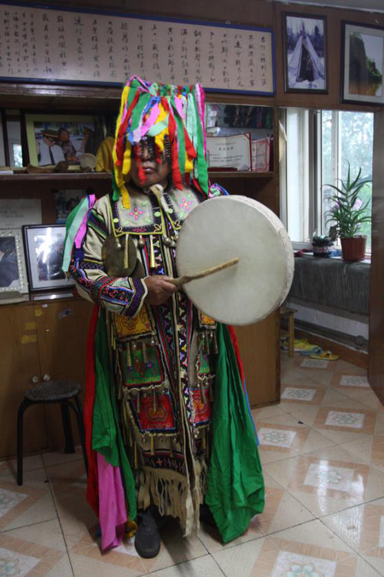 冬天穿的鞋是“奇哈密”和“溫得”,“奇哈密”是用狍脖皮或犴皮做靴底,用狍腿皮拼縫成靿的短靴?!皽氐谩笔怯寐够蜥砥ぷ龅?,鹿或犴腿皮拼縫成靿的長靴?!皽氐谩币驗殪壐?,冬天穿著打獵不易灌雪。這兩種靴子都要用冬季絨毛狍皮做成的襪子配套穿用,暖和跟腳,踩在雪地上沒有聲響。夏天一般穿“奧勞其”,是一種皮底布靿短靴?!翱己袈洹保怯枚窘q毛狍皮縫制的二指手套,掌面腕部留一縫口,手從縫口中伸出,手套仍護(hù)在手背上,既使在零下40度的嚴(yán)寒中處理獵物,也不用擔(dān)心手被凍壞。還有一種五指狍皮手套,背面正中繡花、蝶等中心圖案,五指的關(guān)節(jié)和指甲處繡出各種小型圖案,然后用連理枝將中心圖案和關(guān)節(jié)、指甲圖案連為一體,中心圖案代表手掌,手指圖案代表關(guān)節(jié)和指甲,連理枝代表骨骼和血脈(圖為越來越鮮見的薩滿服飾,吳雅芝供圖)。