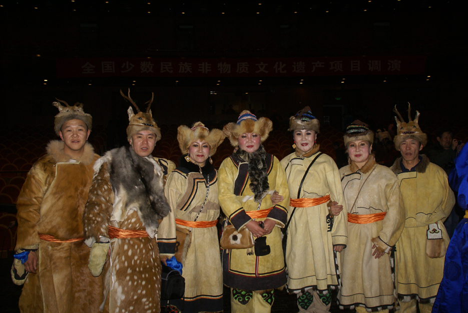 鄂倫春族的傳統(tǒng)服裝以袍式為主,冬季穿“蘇恩”?!疤K恩”是用冬季絨毛狍皮縫制的右任長袍,小立領(lǐng),襟邊、下擺和袖口用黑色皮鑲嵌云卷花紋等邊飾,女袍還要作環(huán)肩裝飾。為便于奔跑和騎馬,“蘇恩”都有開衩,衩口裝飾圖案豐富多彩。夏天穿用夏季沙毛狍皮制作的短袍或坎肩,布匹傳入以后穿布袍。 男子下身穿狍皮短褲,褲腿過膝,樣式如老式免襠褲,后來改穿長褲。出獵時褲子上面還要穿套褲。套褲無襠,呈筒狀,上角釘有皮條,系在腰帶上。一般用夏季的狍皮縫制,因為夏季的狍皮板厚耐磨,也有用鹿皮縫制的。婦女的褲子樣式比較獨特,長至腳面,比男褲瘦些,腰兩側(cè)有開衩,前面有兜肚,兜肚頂端釘皮條,系在脖子上。這樣的褲子,既保暖又便于騎馬,可以護(hù)住前心,又起到了乳罩的作用。講究的人還在褲子兩側(cè)和褲腳處繡上花邊圖案。