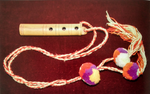 直笛,傈僳語稱之為“迪哩吐”(如圖),多用蘆葦制作,長約5寸,有4個圓孔,3孔在正面,1孔在背面,音量較小,音色柔和動聽,為青年男女抒情和求愛必要的工具。