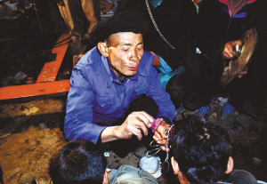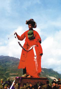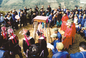 受戒儀式前前后后要舉行好幾天,一般依照受戒者家的經(jīng)濟條件來定。時間短的叫“小辦”,時間長的稱“大辦”。但其中有一條,不論時間長短,度戒中的規(guī)矩是不能違背的。這次十幾位受戒者合起來辦的度戒,聽說是七天七夜的“大辦”。在這幾天中,受戒者必須嚴禁會客、社交、唱歌等,只能低頭修身養(yǎng)性,吃清淡無油的飯和水。度戒中最重要的一件事是聘請師父,有“度師”和“度道”之分,師傅自然有“師公”和“道公” 之分。師宗縣藍靛瑤中的度師為武戒,師公要負責“五臺” 受戒儀式。度道為文戒,道公身穿紅色法衣,負責念經(jīng)求神等儀式。受戒祭師一般由德高望重的長者擔任,他們是寨中一切主要事務的決策者,也是寨中最有學問的人。在受戒儀式中,他們要對弟子進行族史、族規(guī)、社會道德等多方面的教育。
