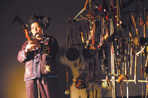 況且,《佤山古歌》并不是一場華麗的演出——演員的道具極其簡單,一些用木頭、動物毛等制成的樂器掛在一個木制的大架子上;演員的服裝并不艷麗,粗布制成的衣服、佤族一貫的“紅+黑”搭配。既然不在包裝上下功夫,也許有什么高科技看點(diǎn),答案也是無,《佤山古歌》的設(shè)備只是一臺多媒體放映機(jī),能播放事先拍攝的影碟而已。