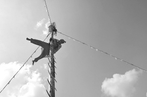 雖然符長(zhǎng)洪教了理論絕招,可是在真刀、真火面前,第一次上場(chǎng)的徒弟們還是搖頭再搖頭,扭捏不敢上。此時(shí),恰逢村里有人家邀請(qǐng)符長(zhǎng)洪去表演,他就趁機(jī)帶著徒弟一起去。表演現(xiàn)場(chǎng),符長(zhǎng)洪用布包著刀刃,要幾個(gè)徒弟爬上刀梯。徒弟們上到梯頂后,符長(zhǎng)洪卻把布條扯開,露出亮晃晃的刀刃,并在刀梯四周點(diǎn)燃火堆大喊:“下來吧!踩到刀上,走過火堆,你們就出師了!”