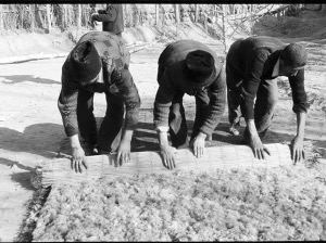 這時(shí),亞生已經(jīng)開始了第二步,他把彈好的羊毛鋪勻,開始噴灑開水。只見他熟練地把水噴向羊毛,然后和妻子一起快速把簾子卷好,用羊毛繩綁緊,再用腳踏著卷好的簾子在平地上來回踏蹬,這樣不停地重復(fù)后,做成了氈坯。亞生停下來解開簾子,拉平氈坯,修整好邊角,又灑上熱開水,把氈坯卷起,這是工藝最關(guān)鍵也是最后一步——他們一起跪在簾上,用雙臂反復(fù)搓滾氈坯,感覺已經(jīng)平整了,夫婦倆又齊心協(xié)力把氈坯展開拉平,放到院子里。此時(shí),亞生長(zhǎng)出了一口氣,抹抹頭上的汗說:“晾干了就可以賣了!”