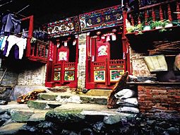 狹長式的房屋大都建在深山里幾十戶大小的村寨。面闊一間并開正門,室內隔間向縱深排列,從正門到后門有7道門之多。正門是大門也是第一道門,是家族的門面,被視為招財進寶和迎接貴客之門。對開門扇高大厚實,門檻上又設兩扇雕刻彩繪的矮門,天熱開大門通風時,可以防止禽畜入戶。大門兩側掛有木刻大字對聯(lián),大門墻面的屋檐下則畫有七彩畫卷。