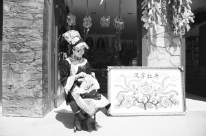午后,張國麗文文靜靜地坐在店前刺繡,繡帕上是一對鮮活的鴦鴦?!盀t灑、飄逸、俊秀是張國麗刺繡創(chuàng)作的風格,許多來旅游的人都是這樣評價的。她獨樹一幟,盡情彰顯了羌風羌韻?!痹樠鄧烂C認真地解說。