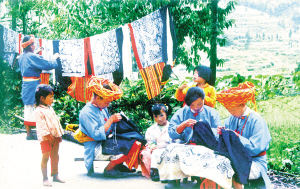 季節(jié)在閑著,整個(gè)寨子卻在忙。漢子們隨意兜幾個(gè)煨熟的紅薯,就出門挖山土、砍柴火去了。女人們則湊到一起說(shuō)著、笑著或哼著,專心做起她們心愛的挑花活計(jì)來(lái)。吊腳樓、屋檐下、火塘邊、堂屋里、巖石上、小溪旁,到處都散落著三三兩兩挑繡花裙的姑娘。提起挑花,姑娘們可就來(lái)神了,個(gè)個(gè)都有一手好絕活,誰(shuí)都可以說(shuō)出好幾個(gè)道道來(lái)。她們從六七歲時(shí)起,就要在娘手把手的嚴(yán)格規(guī)訓(xùn)下,穿針引線,學(xué)著挑花。年復(fù)一年,傾其心智,從不間斷,直到終老。