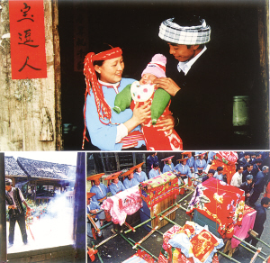 在花瑤同胞心中,沒有什么比人丁興旺、族群繁衍更加重要的了,所以他們常常把生孩子看得比結(jié)婚還要重,并要在孩子出生的第三天舉行熱烈盛大的誕生禮,稱之為“打三斗”。打三斗的禮儀,新奇、熱烈、繁縟而有趣,歷時(shí)兩天一晚。是對(duì)嬰孩、對(duì)主家的道賀,也是對(duì)寨子新添人丁的祝福。