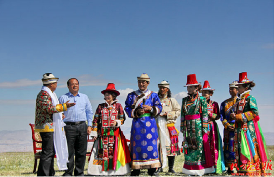 CCTV7《鄉(xiāng)約》欄目錄制現(xiàn)場(chǎng)。向全國(guó)觀眾介紹肅南縣及裕固族文化。央金攝 引自民族畫報(bào)