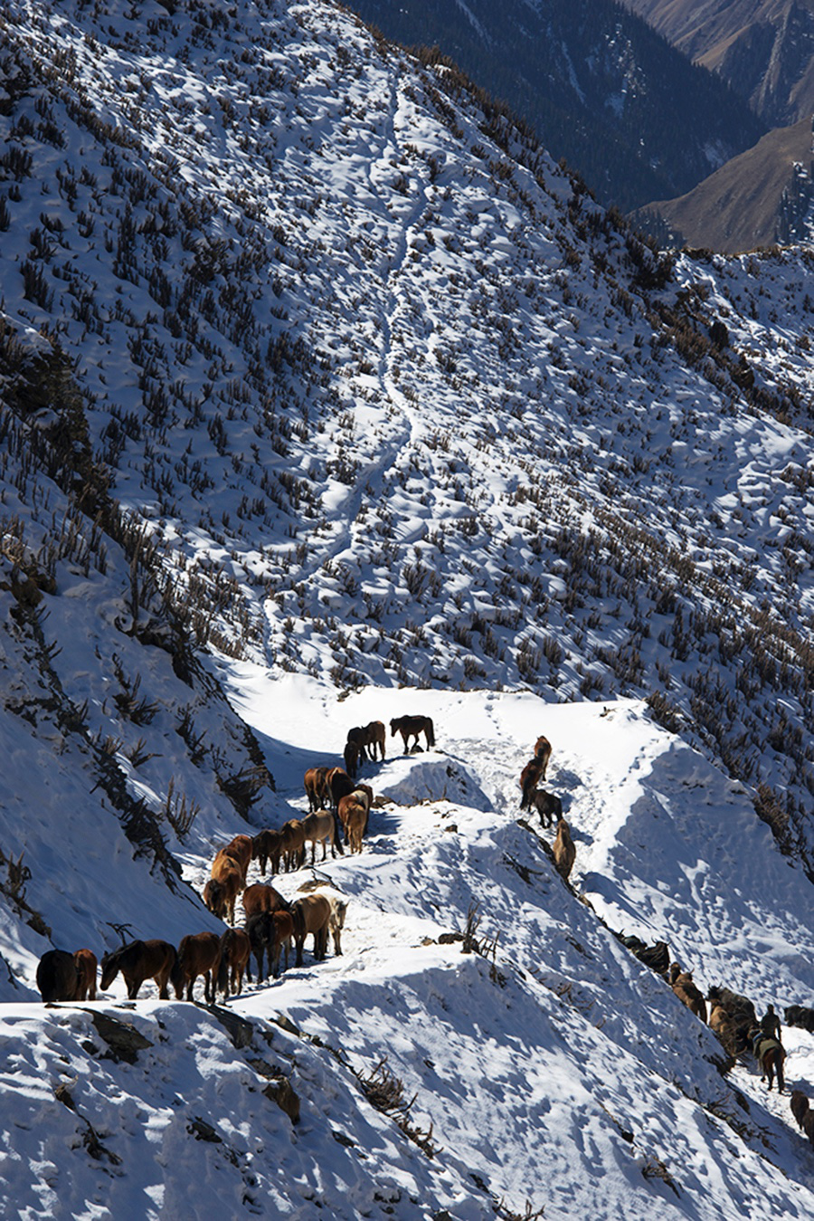 在數(shù)次轉(zhuǎn)場(chǎng)中,去往冬牧場(chǎng)最為艱苦。10月的巴音布魯克,臨近天山的多變氣候常會(huì)帶來(lái)大雪。春牧場(chǎng)的豪華氈包不適用,駐扎或轉(zhuǎn)場(chǎng)使用的多是僅有十幾根棍支撐的“角洛姆”。就簡(jiǎn)易和實(shí)用的雙重價(jià)值而言,“角洛姆”堪比印第安人的帳篷和哈薩克族人的單人野宿帳篷。不過(guò)我相信,“角洛姆”的歷史一定早于蒙古包。見到它,蒙古人數(shù)千年的飄泊歲月一下連通。正是“角洛姆”的庇護(hù),才使得當(dāng)年的蒙古大軍馳騁歐亞大陸少了一份累贅,亦如我隨著彭才一家往冬牧場(chǎng)的轉(zhuǎn)場(chǎng),白天把“角洛姆”綁在駝垛子上,晚上支架起來(lái)就是一個(gè)家。轉(zhuǎn)場(chǎng)第二天,馱運(yùn)“角洛姆”和一應(yīng)家什的駱駝、牦牛翻越海拔3000米之上的恰布恰勒達(dá)坂前往冬牧場(chǎng)。這條路最大的好處是寬,不至于把捆在駱駝或牦牛身上的垛子撞翻。羊群、馬群和不馱東西的牦牛走特克斯河牧道,路程短一半,只是行走難度大。一條羊腸道,時(shí)常就在崖壁之下通過(guò),一地碎石滾落,數(shù)十米之下就是咆哮的特克斯河。牧道最窄的地方,容不得兩匹馬錯(cuò)過(guò)——這是巴音布魯克草原最為驚心動(dòng)魄的冬季轉(zhuǎn)場(chǎng)牧道。