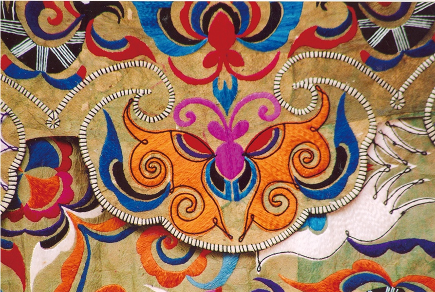 在苗族各種工藝的服飾圖案中,蝴蝶是俯拾皆是的,而丹寨縣雅灰鄉(xiāng)和榕江縣高排鄉(xiāng)等地的苗族百鳥(niǎo)衣上,大面積地使用絲帛和絲線(xiàn)刺繡,常在中心位置繡著一種奇特造型的動(dòng)物圖案,頭是變形的鳥(niǎo)頭,身是蟲(chóng)身,有節(jié),周?chē)秋w舞的蝴蝶。不少人解釋它為龍。其實(shí)那是蠶蟲(chóng)、鳥(niǎo)、蝴蝶的結(jié)合:蝴蝶——鳥(niǎo)——蠶蟲(chóng)——一幅圖本身就包含了蝴蝶圖騰的全部寓意。