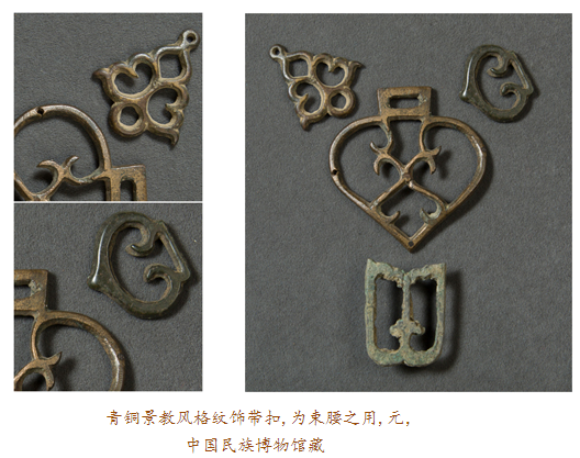 眼前此件在內(nèi)蒙古達茂旗出土的元代鎏金青銅十字架,四面排列有浮雕金剛杵紋,其正面每個金剛杵圖案上均有鎏金裝飾,十字架上部穿孔則可用于懸掛。金剛杵是藏傳佛教里的修行法器,象征力量與智慧;而十字架則是基督教文化的標志,如此混搭,歷史便要傳遞出種種:在信仰藏傳佛教的蒙古高原,金剛杵,象征無畏圓滿,十字架,則代表救贖重生,東西方文化的結(jié)合亦呈現(xiàn)某種文明可能達到的無可比擬之高度。