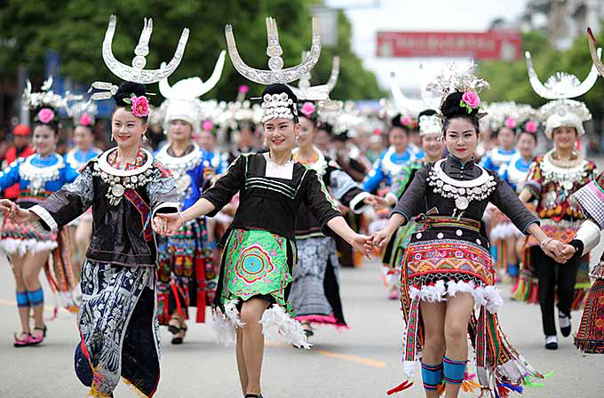 2017年4月28日,黔東南苗族侗族自治州丹寨縣盛大舉行“云上丹寨?遠(yuǎn)古霓裳”丹寨八大支系服飾巡游活動,來自全縣六個鄉(xiāng)鎮(zhèn)八大支系的2000余名苗族同胞身著節(jié)日盛裝,集聚在縣城錦雞廣場進行服飾展演(黔東南苗族侗族自治州人民政府網(wǎng))