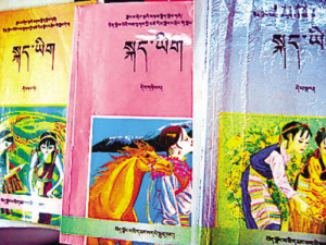 西藏昌都地區(qū)實(shí)驗(yàn)小學(xué)的學(xué)生們?cè)谝黄鹉钫n文