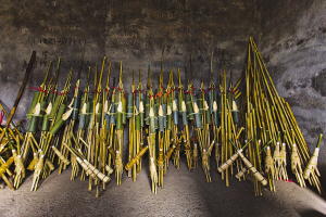 制蘆笙最難的是做笙斗和簧片。笙斗是蘆笙的心臟。首先要將一整塊木質(zhì)稍硬的木材加工成葫蘆斗,然后把木材劈開。掏空葫蘆斗內(nèi)壁后,用兩段竹青編好的箍把空葫蘆斗重新箍緊,然后用電鉆在斗壁上開若干氣孔??组_好后,把笙管分兩排呈60度—80度角插入笙斗,每根竹管均在近笙斗處開1個音孔,再以篾片或麻線捆束,蘆笙就大致成型了。
