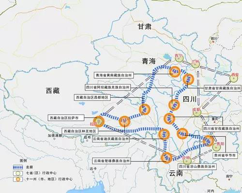 藏羌彝文化產(chǎn)業(yè)走廊依托的城市樞紐包括:四川省成都市、貴州省貴陽市、云南省昆明市、西藏自治區(qū)拉薩市、陜西省西安市、甘肅省蘭州市和青海省西寧市。