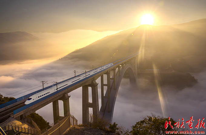改革開(kāi)放40年來(lái),少數(shù)民族和民族地區(qū)成為改革開(kāi)放的切實(shí)受益者,2017年1月1日,滬昆高鐵線上的列車沐浴著新年的陽(yáng)光飛馳在云貴高原上(史家明 攝影)
