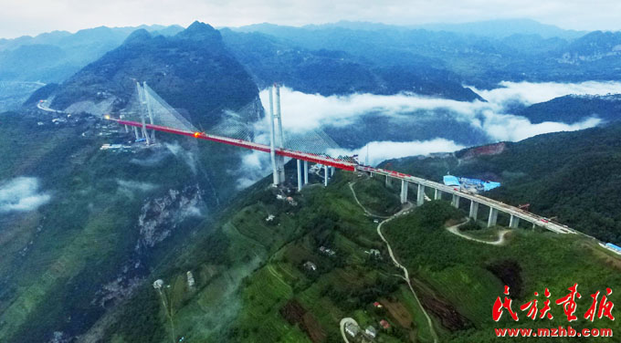 我國(guó)東西橫線大通道杭瑞國(guó)家高速公路的關(guān)鍵節(jié)點(diǎn)——畢節(jié)至都格高速公路北盤(pán)江大橋。該橋橋面到谷底垂直高度達(dá)569.66米,為世界第一高(鄧剛 攝影)