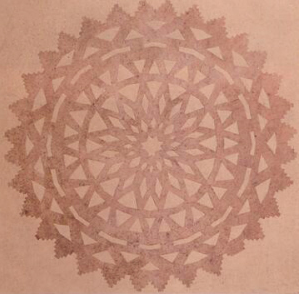 該剪紙出土于吐魯番市阿斯塔那303號(hào)墓,不僅保存完好,而且構(gòu)圖對(duì)稱(chēng)、畫(huà)面均勻、線(xiàn)條流暢、美觀大方,可以和現(xiàn)代民間剪紙藝術(shù)相媲美。剪紙為圓形,呈土黃色,中心圖案為八角花形,依次向外為兩圈菱形花紋,交叉錯(cuò)落,排列有序;再向外圈為梯形紋組成的三角形邊飾。整個(gè)剪紙圖案層次分明,變化繁復(fù),頗有韻律感。這幅剪紙為折疊后一次剪成,造型簡(jiǎn)潔,刀法洗練,具有古樸濃郁的民間風(fēng)格。